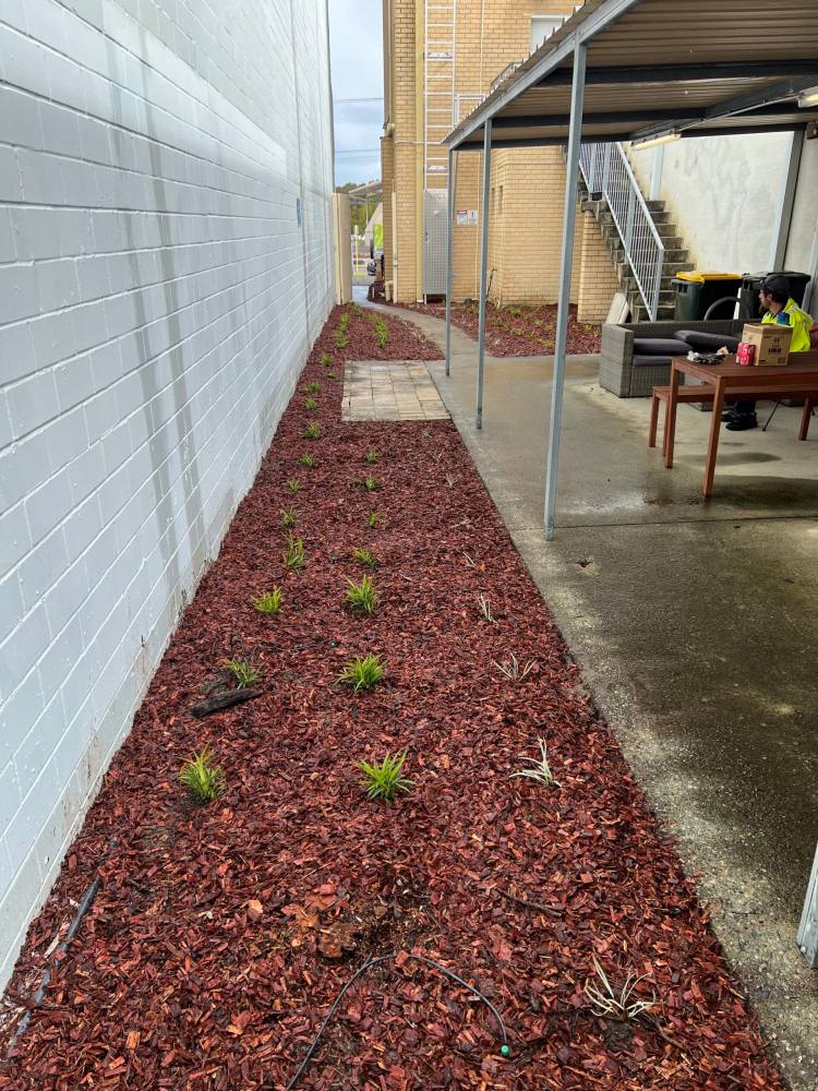 We pruned the trees, weeded the garden beds and treated with a pre-emergent herbicide, created a stone path and added a good quality mulch to the garden beds.